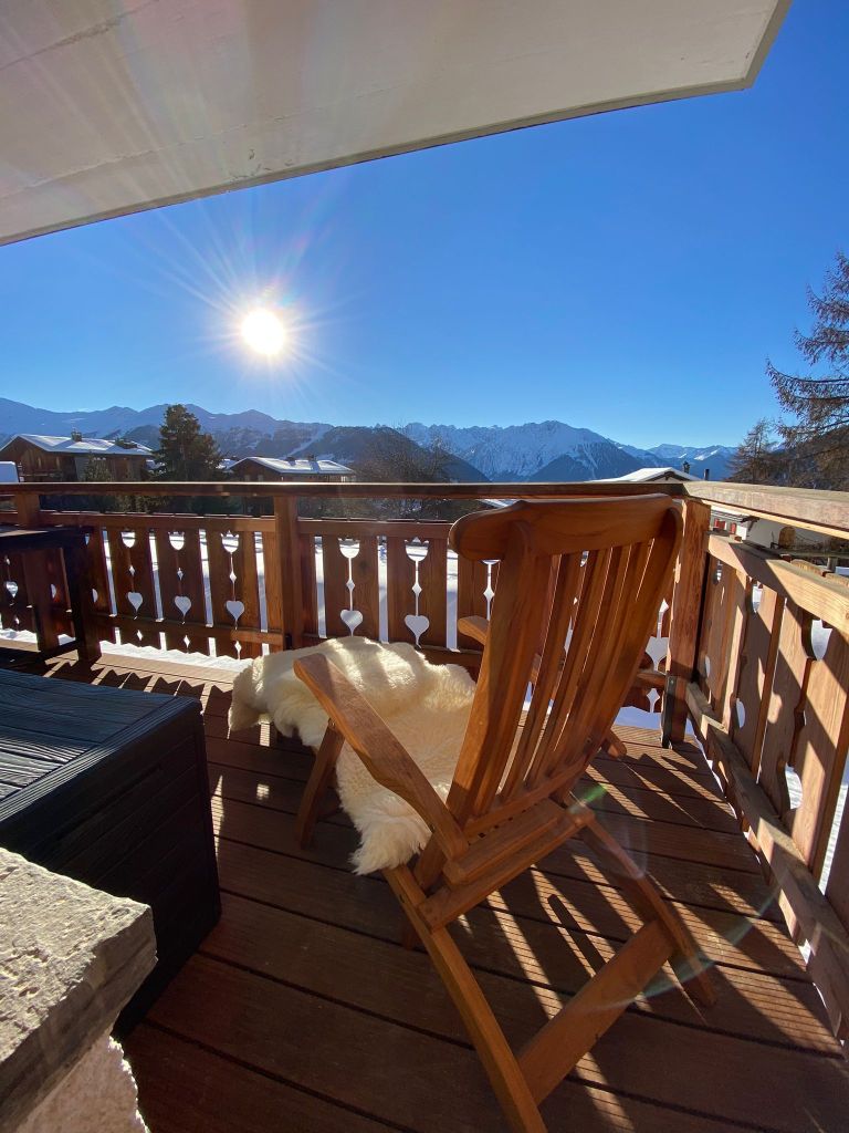 - Outside sunny private terrace with mountain views, dining table and lounge area